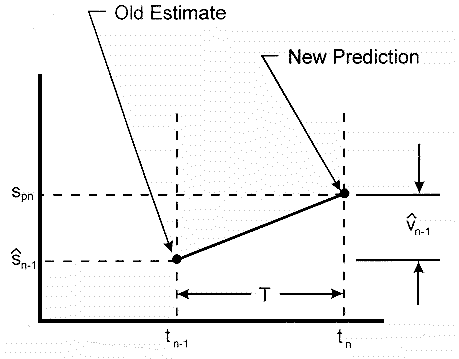 The last position estimate is used to predict the current position. The prediction is based on the last estimate of rate.