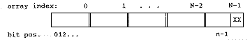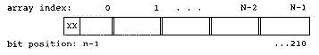If you need n bits, then you need N = ceil (n / BLKSIZ) array elements, where BLKSIZ is the number of bits in an unsigned (or whatever integral type you derive the array from). If n is not a multiple of BLKSIZ, then there will be unused bits in the zeroth block (represented by XX in the preceding figure). Now, accessing a particular bit reduces to finding the particular block it resides in, and computing the offset for the mask to apply to that block. To find the right block, notice the following pattern: