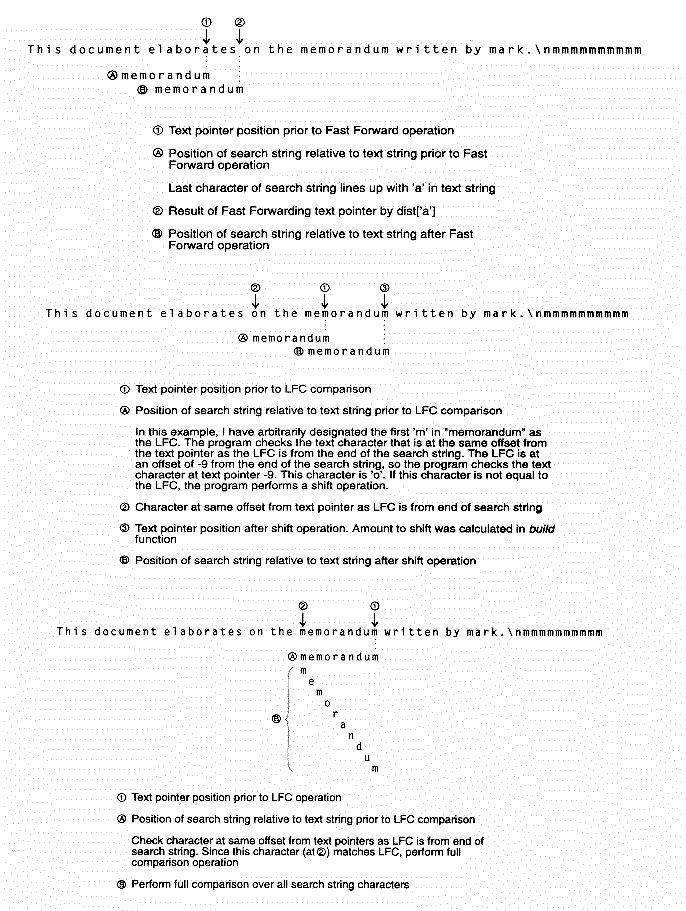 Detailed illustration of Boyer and Moore text search, with fast forwarding, lfc comparison, and shifting