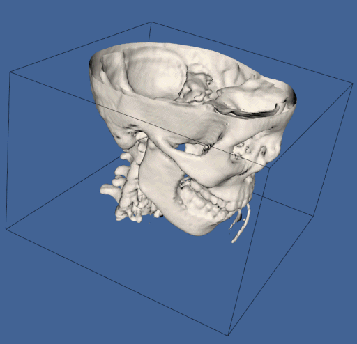 One of the most exciting applications of visualization is in medical imaging. In the next example I show a simple application to read a CT dataset and generate a view of the skull.