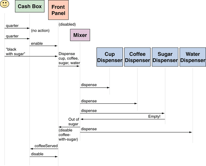 Figure 3: Interaction diagram showing machine (1) serving coffee, running out of sugar