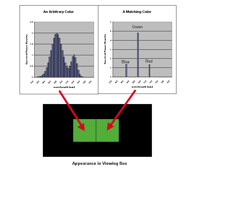 Figure 1: A mixture of three colors in the proper amounts can match the appearance of a color made up of many frequency components