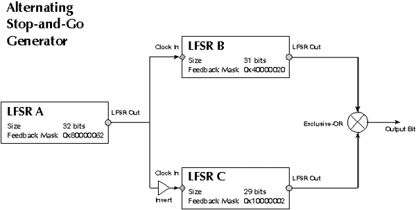 Figure 3: Three shift registers organized as an alternating stop-and-go random number generator
