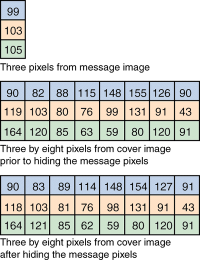 Figure 2: Hiding three pixels from the column of a message image in three rows of the cover image (pixel values shown in decimal)