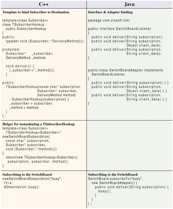 Table 1: Side-by-side comparison of C++ and Java code to create a subscription