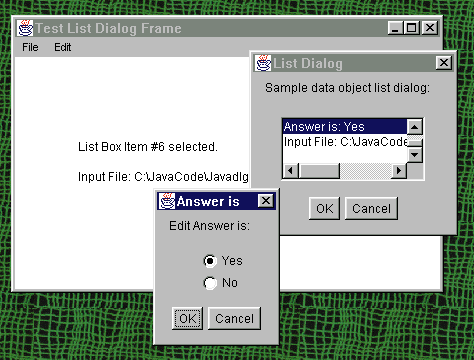 Figure 1: The frame-window application with the list dialog and a yes-no radio dialog opened to update one of the list items