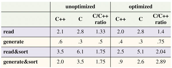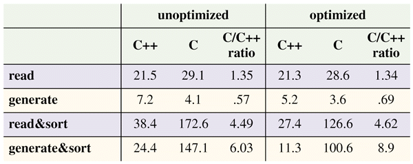 Table 2: Reading and sorting floating-point numbers. A random-number generate'' function is added to give a feel for the cost of input.