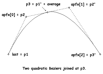 Figure 7: Stitching two quadratic Bezier curves together smoothly in a TrueType QSpline record. Points p2 and p2' in the record are handles off the curve, but their midpoint (average) is a common control.
