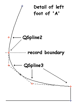 Figure 9: Detail of left foot of 'A' showing two adjacent QSpline records. QSpline3 consists of three points defining two smoothly joined Bezier curves.