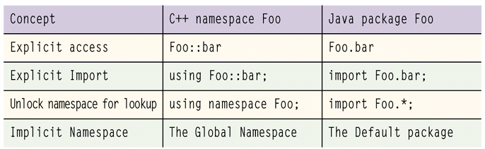 Table 1: Compares C++ namespaces and Java packages