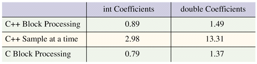 Table 1: Time required for the filtering of 800,000 short int samples with a filter of 47 coefficients (in seconds)