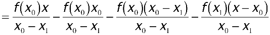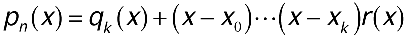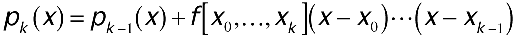 Since (x - x0)...(x - xk)r(x) becomes 0 when x is any point in x0,...,xk, qk(x) already interpolates f(x) at x0,...,xk. Since qk(x) is a polynomial of degree <= k, it follows that qk(x) = pk(x); therefore, qk(x) is the polynomial of degree <= k that interpolates f(x) at x0,...,xk. This is important because it means that you can construct each successive pk(x) incrementally from its predecessor, pk-1(x). To compute pk(x), add pk-1(x) to the next term in the Newton form, as shown below.