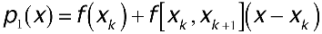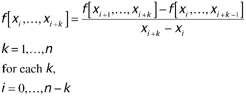 To compute the value of each f[x0,...,xk], the coefficients of the interpolating polynomial, use the procedure described next. Let f[x0] = f(x0) and f[x0, x1] = (f(x1) - f(x0)) / (x1 - x0), which you can verify algebraically by manipulating p1(x) derived from the Lagrange formula as outlined below.