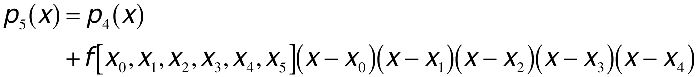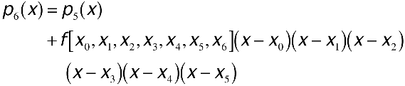 Of course, normally you won't know f(x), so you must look for a way to estimate the value of en(x) in practice. Assuming X to be some point different from x0,...,xn, let pn+1(x) be the polynomial that interpolates f(x) at x0,...,xn and X as well. In other words, pn+1(X) = f(X). Recall that you can construct the interpolating polynomial pn+1(x) from the interpolating polynomial of one degree smaller, pn(x), using the Newton form. Therefore, since pn+1(x) interpolates X, the error in pn(x) is given by the next term added to pn(x), which produces pn+1(x).