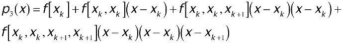 Formally, to approximate f(x) at some point x, given a series of n + 1 values for f(xi), i = 0,...,n, x0 < ... < xn, you determine the interval [xk, xk+1] on which x resides and evaluate the third-degree interpolating polynomial. Considering this, if xk and xk+1 are the only two points for which you know values for a piece of f(x), it's worth asking where the other two of the four requisite points come from. Different piecewise-cubic interpolation methods answer this question in different ways. Piecewise-cubic Hermite interpolation answers the question by selecting the points xk, xk, xk+1, and xk+1. Selecting these points ensures two things: first, that p(x) agrees with f(x) at x = xk and x = xk+1 (as with any interpolating polynomial); and second, that p'(x), the derivative of p(x), also agrees with f'(x), the derivative of f(x), at x = xk and x = xk+1. The Newton form of the interpolating polynomial generated from these points is shown below.