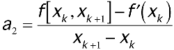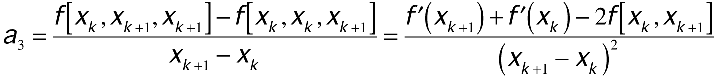 In this polynomial, each of the four coefficients, call them a0, a1, a2, and a3, is a divided difference expressed in terms of xk and xk+1. To determine the value of each coefficient, use the formulas that follow. To see where these formulas come from, construct a divided-difference table using the points x0 = xk, x1 = xk, x2 = xk+1, and x3 = xk+1. In the table, wherever you see (f(xk+1) - f(xk+1))/(xk+1 - xk+1), replace it with f'(xk+1); wherever you see (f(xk) - f(xk))/(xk - xk), replace it with f'(xk). Listing 4 shows how to perform piecewise-cubic Hermite interpolation in a program.