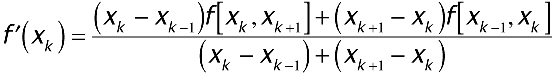 Piecewise-cubic Bessel interpolation is similar to piecewise-cubic Hermite interpolation, except that it substitutes an approximation for f'(x) in the computation of coefficients for the interpolating polynomial. In piecewise-cubic Bessel interpolation, you carry out the same computations as those presented for a0, a1, a2, and a3 above, except you use the formula below for each f'(xk). This formula requires the use of two additional points, one to the left of x0 and one to the right of xn, to give some number for derivatives when interpolating the leftmost and rightmost pieces. Listing 4 performs piecewise-cubic Bessel interpolation when you use approximations for f'(x).