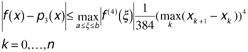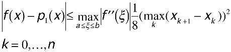 From the basic error formula, you can derive formulas for piecewise-linear interpolation and piecewise-cubic Hermite interpolation as well, which are listed in order below (assuming interpolation over the interval I = [a,b] and n + 1 interpolation points). There are two things to notice in these formulas: first, you can reduce the interpolation error as small as necessary by making the distance between interpolation points smaller for all k; and second, you can reduce the error by using interpolating polynomials of a greater degree for each of the pieces (as in the case of trying piecewise-cubic interpolation as opposed to piecewise-linear interpolation).