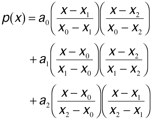 For a set of n + 1 points x0,...,xn along a function f(x), you would construct the Lagrange form of a polynomial with n = 2 as follows: