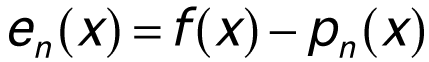 This section describes the error associated with the various interpolation methods presented in this article. Fundamentally, the interpolation error en(x) associated with any interpolating polynomial pn(x) of degree <= n interpolating a function f(x) is defined by the equation below.