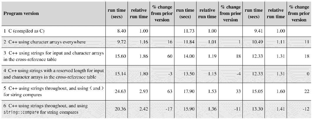 Table 1: Comparison of execution times using strings vs. arrays of char on various compilers