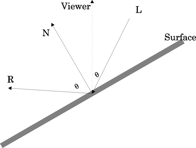 Figure 2: Calculating intensity of light reflected toward the viewer from a surface at an arbitrary angle