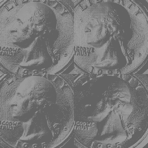 Image 3: Four different renderings of depth image of quarter, with light vector L coming from four different directions