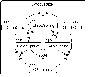 Figure 3: Object instance diagram of the software representation. The CProbSpring and CProbCord objects represent two equations each and reference the positions and forces stored in CProbLattice.