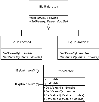 Figure 4: Class diagram of CProbVector and related interfaces. Since CProbVector must implement the IEqUnknown interface in two different ways, it uses two intermediate interface classes.