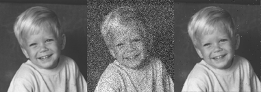 Image 2: Applying a median filter to impulse noise. Left to right: original image; image corrupted with noise; good result of the median filtering