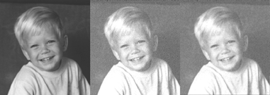 Image 4: Cleaning up Guassian noise with an MMSE filter. Left to right: original image; image with Guassian noise; cleaned by MMSE filter