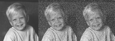 Image 5: Applying an MMSE filter to salt and pepper noise. Left to right: original image; image with salt and pepper noise; after filtering not cleaned up very well by MMSE filter