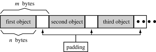 Figure 2: What "contiguous" means typical in-memory layout of an array of n-byte structs that require m-byte alignment