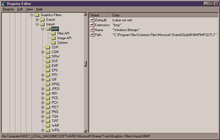 Figure 1: Sample registry keys and values for graphic import filters