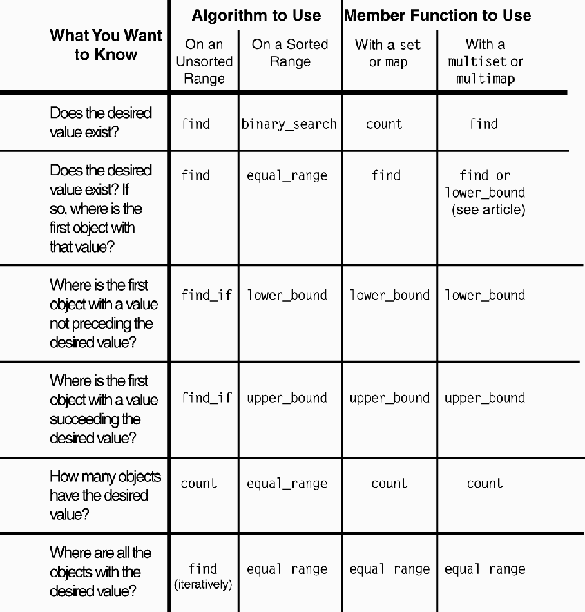 Table 1: Choosing algorithms and member functions