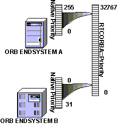 Figure 3: Mapping CORBA priorities onto two ORB end systems with different native priority ranges