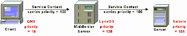 Figure 5: An invocation from a client on one ORB end system to a server on another results in an invocation on an intervening ORB end system, each with different native priority ranges