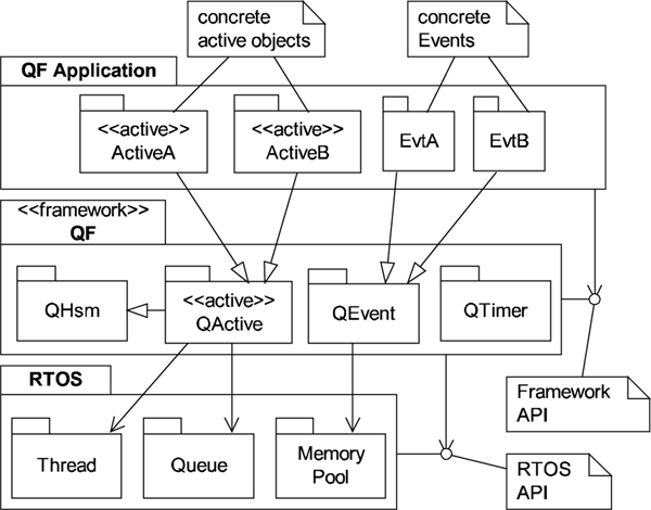 UML package diagram illustrating relationships among RTOS, QF, and QF-Application
