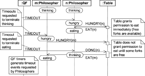 Sequence diagram showing event exchange in the active object-based solution of the DPP