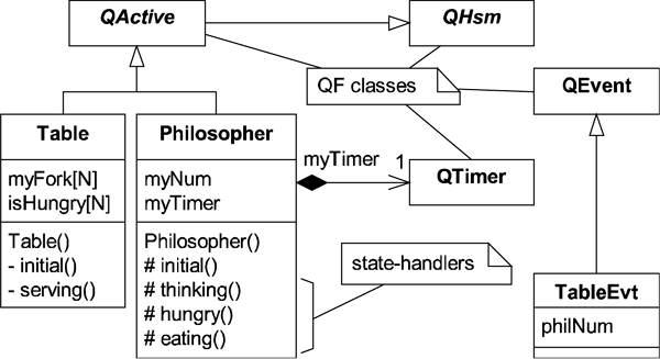 Table and Philosopher active objects and the TableEvt class derived from the QF base classes