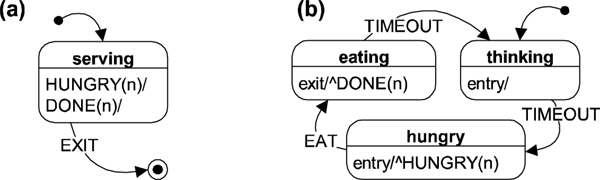 (a) Table statechart and (b) Philosopher statechart; the ^DONE(n) notation indicates propagation of the DONE event with parameter n (for the n-th Philosopher)