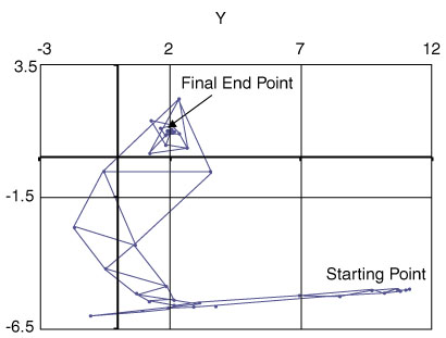 The succession of simplexes from the starting point at ( 11, -5 ) to the end at ( 2, 1 ). All cases of reflection, expansion, contraction, and shrinking occur.