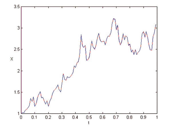 Example 3(b) dashed, and the Runge-Kutta (strong order 1.5) solution of Example 3(a) for a step size of 0.01 (and multiplier 1).