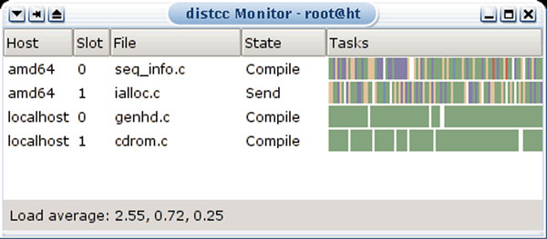 Monitoring a kernel compile process that has been distributed to a very fast AMD64/NForce3 workstation.