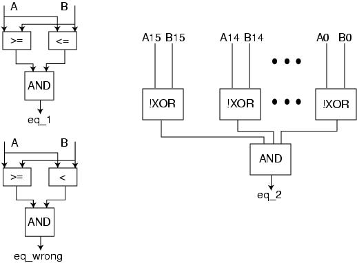 Figure 2: Three functions aimed to implement a comparator of 16 bits. While eq_1 and eq_2 are correct, eq_wrong is a deliberately wrong implementation.