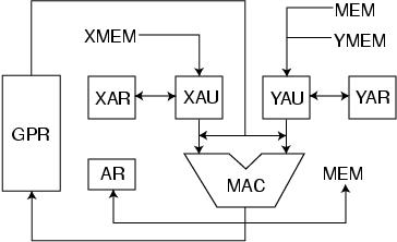 Figure 1: Example DSP processor architecture with dual-input memory data path and MAC unit.