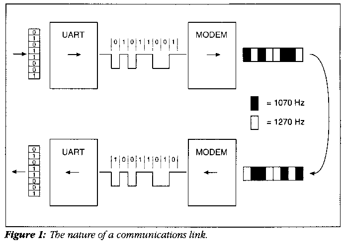 If this were all it took to implement a communications link, I wouldn't be bothering to write whole columns about it. Figure 1 shows you the idea of a link through a serial port and modem, but it ignores a very serious problem: The UART doesn't retain characters somewhere until they are read. It simply places an incoming character up on a rack and expects you to come and get it. If a second character comes in on the link before you have had a chance to grab the first one, the first character will be nudged into nothingness and the second character will take its place.
