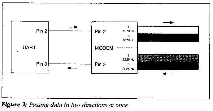 The cable between the serial port and the modem does not deal in audio tones. It deals in voltage levels, which do not mix well on a single wire. This is why your typical serial cable has two data conductors: One for data passing into the serial port, and another, separate conductor for data passing out of the serial port. (See Figure 1.) The UART, like the modem, is thoroughly ambidextrous and can handle data moving through itself in two directions at once without a burp.