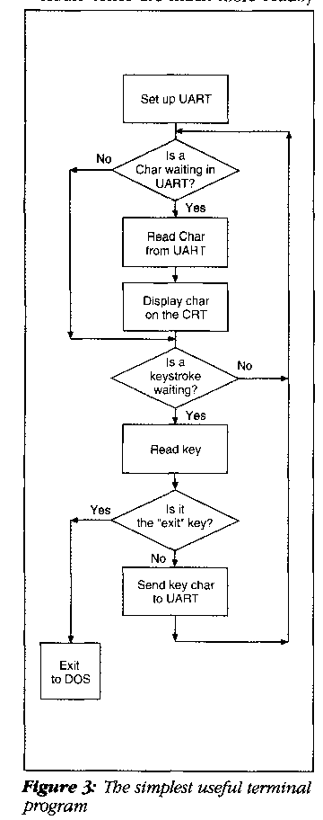 Keeping all of that in mind, the fundamental nature of a simple terminal program is simple indeed. I've drawn up a flowchart in Figure 3 to show you how simple it is.