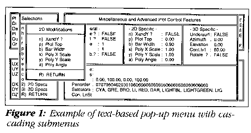 There are actually at least two stages of operator interface development beyond the simple "question --> wait for answer" type of program control. We can loosely define text-based pop-up windows as a simpler form of GUI interface for displays limited to characters instead of high-resolution bit maps. Figure 1 is an example of a typical text based pop-up menu display.